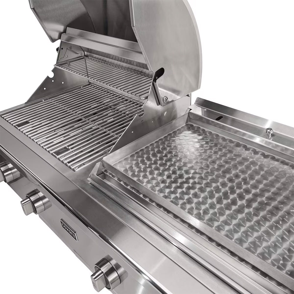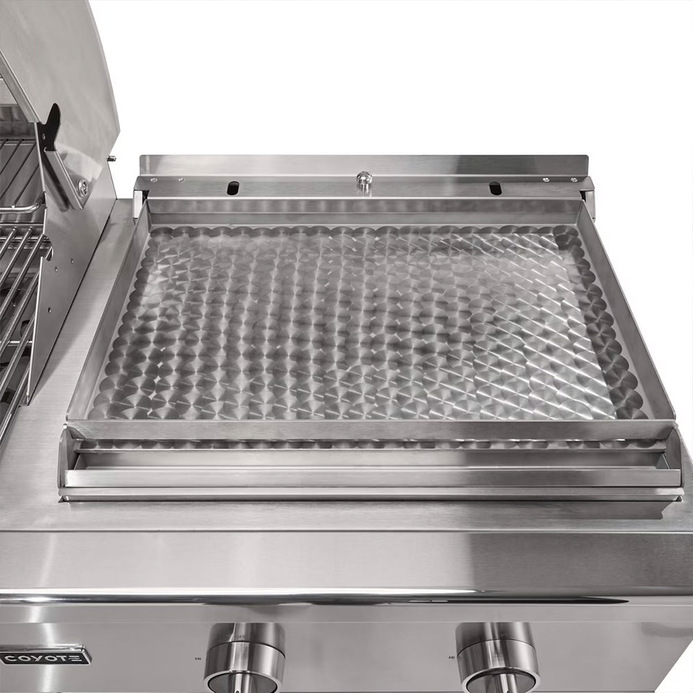 The Coyote 50-inch built-in combo grill offers unmatched versatility by combining a traditional gas grill with an integrated flat-top griddle. This dual-zone setup allows you to sear steaks on the Infinity burners while simultaneously cooking sides or toppings on the flat top with its U-shaped burners.